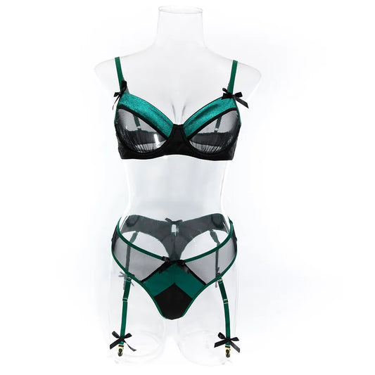 nihaodropshipping wholesale new embroidery lace mesh see-through underwear three-piece suit
