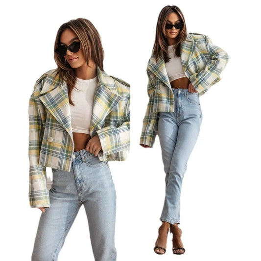 Streetwear Plaid Double Breasted Coat Casual Jacket
