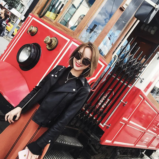 Slim Fit Long Sleeve Short Leather Jacket Women's Motorcycle Style Street Fashion Autumn Winter New Arrival