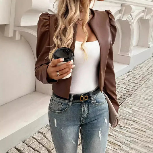 Elegant PU Leather Suit Jacket Women's Fashion Outerwear European Style Long Sleeve Short Coat Pure Color Double Breasted