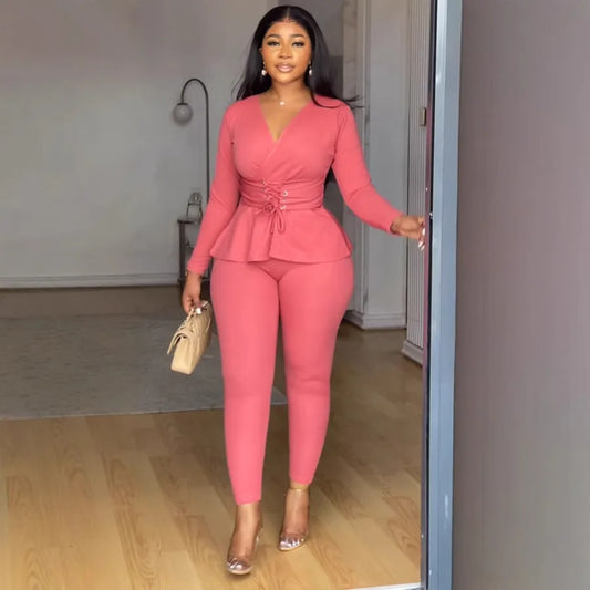Elegant Pure Color V-neck Waist-cinched Long Sleeve Suit European Style Women's jumpsuit Comfortable Elastic Basic Long Pants