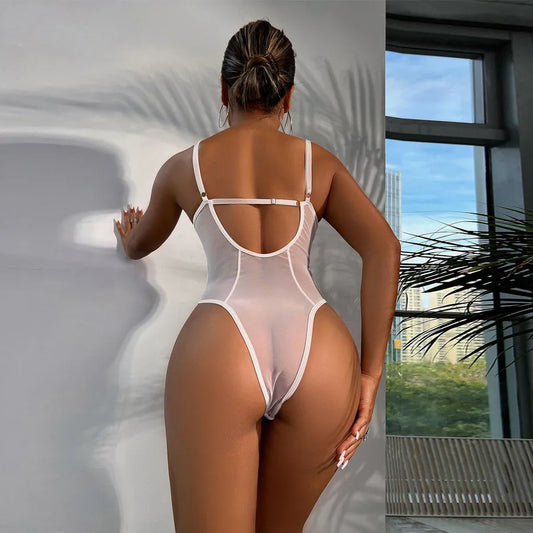 european station cross-border new sexy jumpsuit ins mesh strap stitching complex heavy craft neck sling leg ring