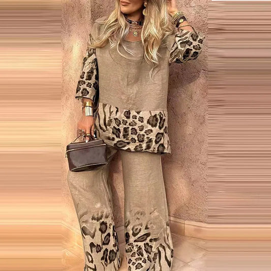 Daily Khaki Women's Casual Vintage Style Bohemian Leopard Polyester Pant Co-ord Set Pants Pants Sets
