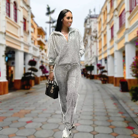 Women's Slim Fit Sequin Casual Two-Piece Set Long Pants Geometric Pattern Polyester Long Sleeve Fashionable Elegant Style