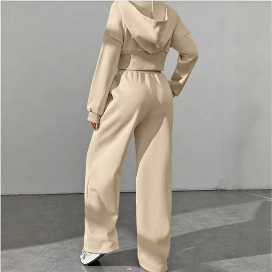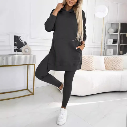 Casual Fashionable Women's Zipper Hooded Long Sleeve Sweatshirt Cardigan Sport Two-Piece Set Elastic Waist Pure Color Pattern