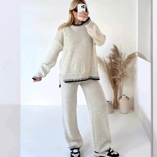 Hot Selling Knitted Women's Two-Piece Set Long Sleeve Top And Casual Wide Leg Pocket Pants Ensemble