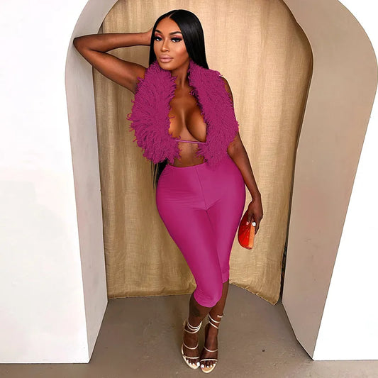 Sexy Fur Crop Top And High Waist Seven Length Pants Two Piece Set J25ST206 Women's Fashion Casual Wear European Style Street Snap