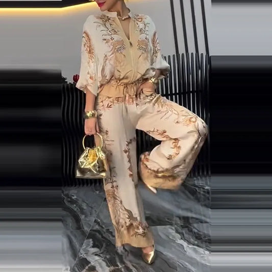 Elegant Sexy Floral Print Top Wide Leg Pants Two Piece Set Summer Fashion Casual Outfit Polyester Long Sleeve Long Pants