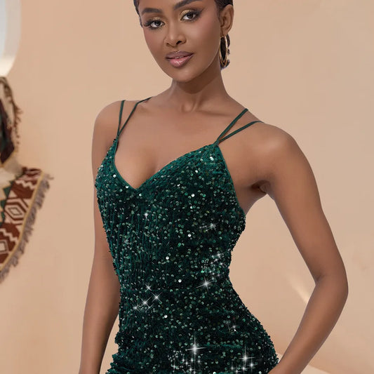 Shiny Sequin V-Neck Sleeveless Party Dress Fashionable Tassel Halter Gown Polyester Fabric Sexy Style Pure Color Design