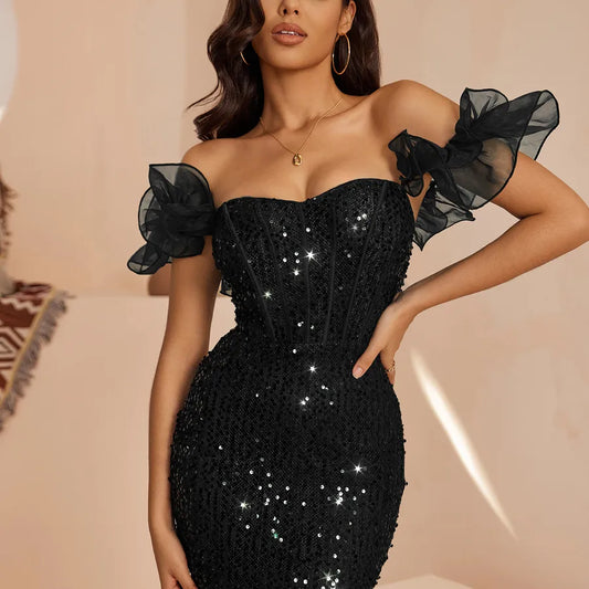 Summer Sexy European Style Sequin Strapless Bodycon Dress Shoulder Bared Alluring Back For Women Polyester Fabric Sleeveless