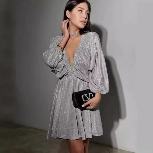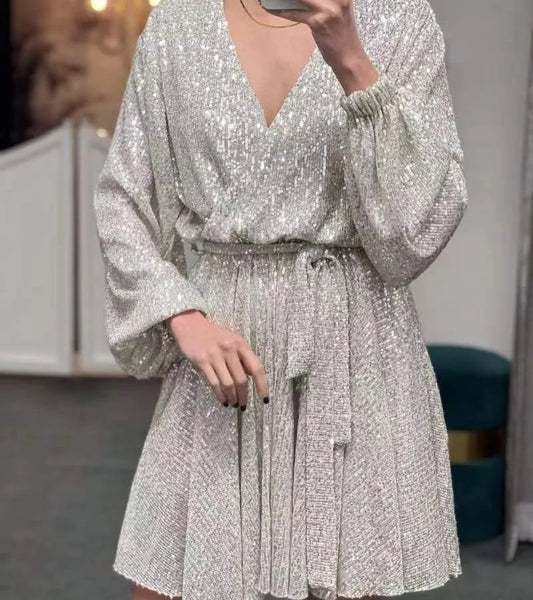 women's sequin dress sexy v neck sequins long sleeve solid color above knee banquet party
