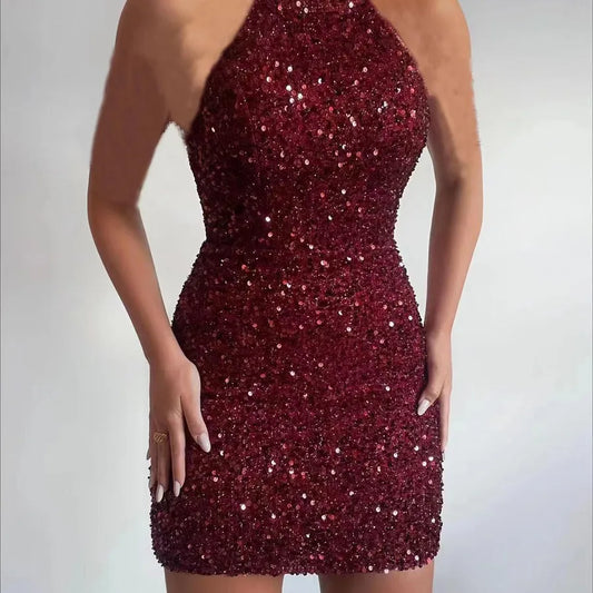 women's sheath dress sexy halter neck sequins sleeveless solid color above knee banquet