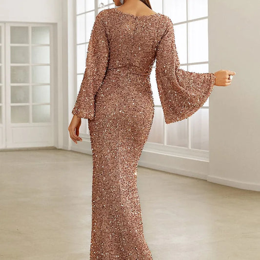 women's party dress elegant luxurious v neck sequins diamond long sleeve solid color maxi long dress banquet evening party cocktail party