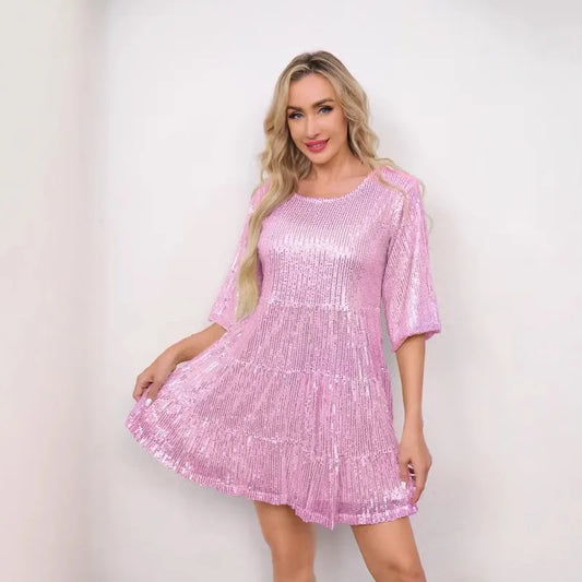 Elegant Solid Color Loose Waist Short Sleeve Mini Dress Party Sequin Gown Fashionable Style A-Line Skirt