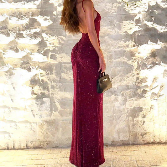Elegant V-Neck Sexy Split Hanging Neck Dress Evening Gown Formal Ball Fashionable Waist-Cinching Floor-Length One-Piece Dress