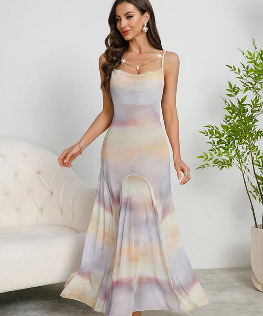 Graduated Color Style Women's Dress Colorful Strap Mesh Chain Swinging Neck Sleep Dress Fashionable Nightgown Polyester Long Dress