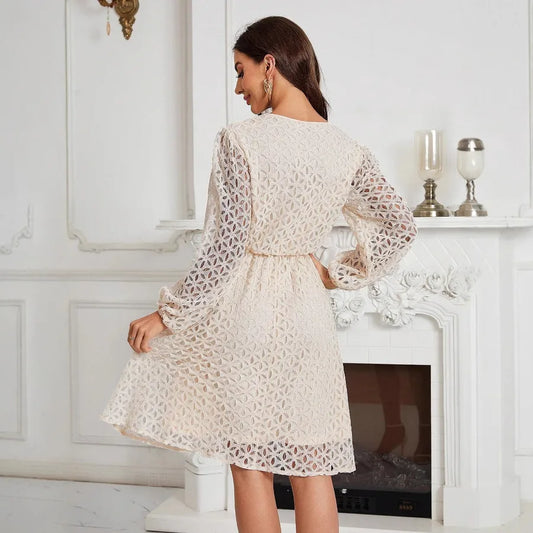 Elegant Long Sleeve Lace Dress Waist Cinched Belted Hollow Out Style Women's Fashion Knee High A Line Dress
