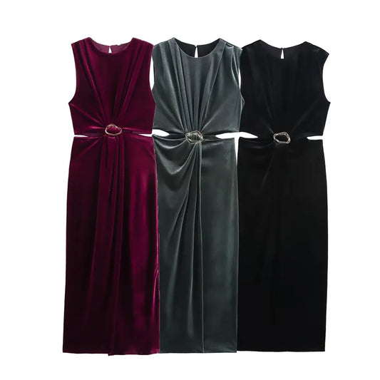 New Women's Sleeveless Velvet Midi Dress Buckle Embellished Pleated Street Style Round Neck A-Line Skirt Polyester Fabric