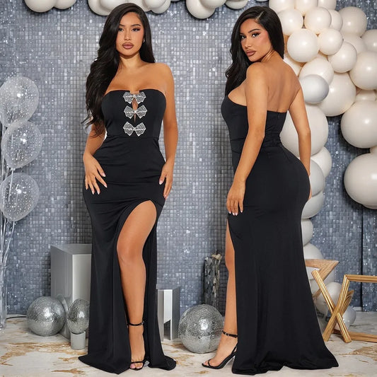 Elegant High Slit Long Dress With Butterfly Knot Design European Style Women's Party Tube Dress Sleeveless Bodycon Dress
