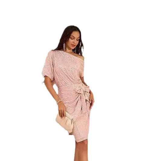 Elegant Short Sleeve Glittering Club Party Dress For Women Fashionable Chiffon Sequin Patchwork Shoulder Pleated One-step Skirt