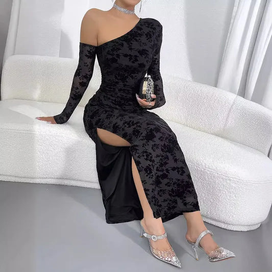 Elegant High-End Flocking Slant-Shoulder Design Slimming Split Evening Dress New Style Sexy Long Sleeve Floral Patterned Ball Gown