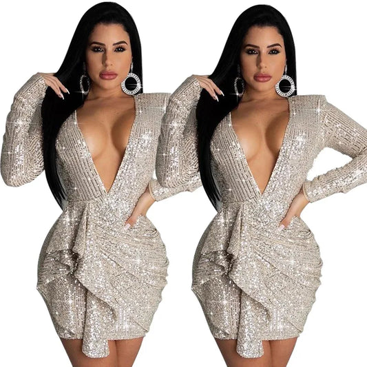 Sexy V-neck Bodycon Mini Dress Sequin Evening Gown Asymmetrical Skirt New Arrival Elegant Long Sleeve Pure Color Cocktail Dress