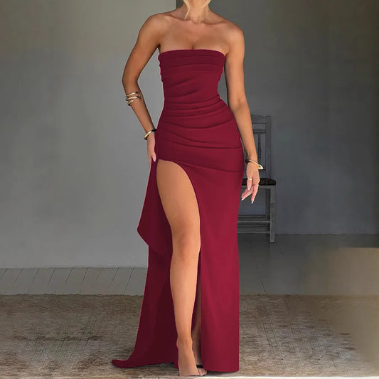 Fashionable Sexy One Shoulder Backless Long Dress Evening Gown Women's Strapless Dress High Slit Autumn Elegant Style Without Sleeve