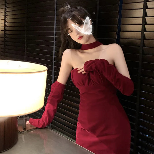 Sexy Velvet Bustier Christmas Red Dress Clubwear Autumn Winter New Style French Retro Folded Sleeve Long Sleeve Elegant Commute