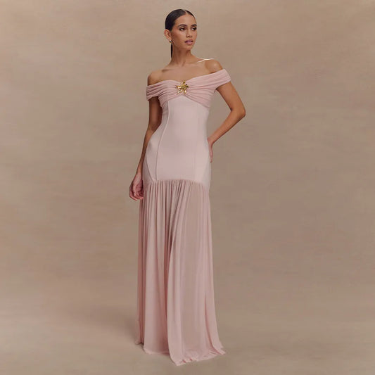 Elegant Fish Tail Gown Satin Long Dress Shoulder Bared Evening Dress Style Sexy Pure Color Wrap Chest Design
