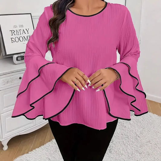 Elegant Pink Oversized Shirt With Flounce Sleeves And Round Neck For Women Resilient Color Contrast Trimming Sweet Style