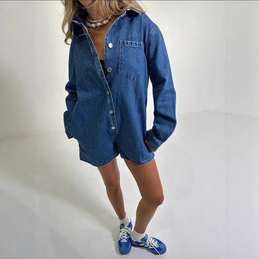 Retro Thickened Oversize Collar Button Denim Shirt For Trendy Girls Commute Style Basic Pure Color Loose Fit Mid-Length