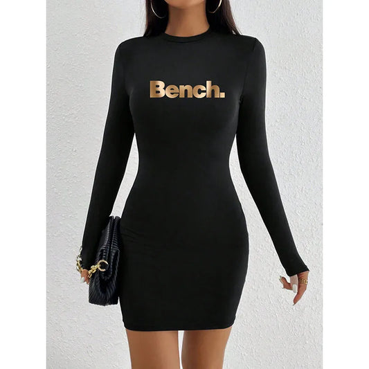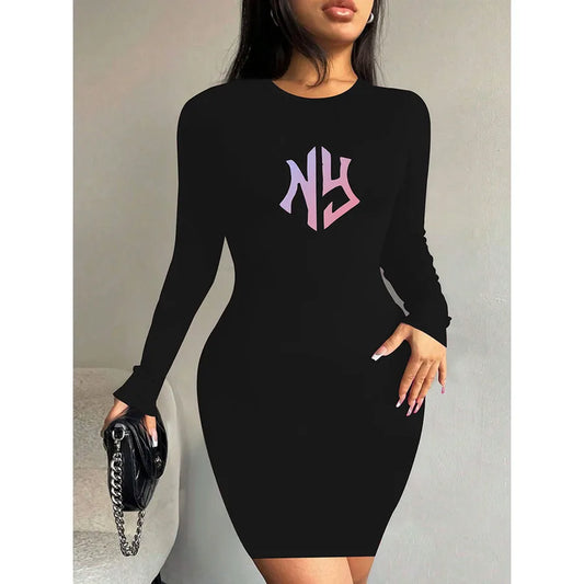 Fashionable Long Sleeve Slim Fit Printed Dress For Women Casual Style Knee High Autumn Spring Dress Polyester Fabric Round Neck