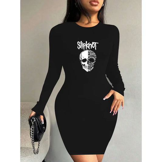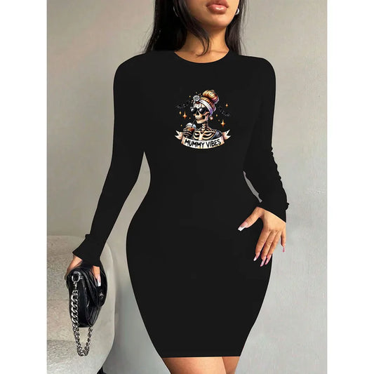 Fashionable Long Sleeve Printed Dress Women's Autumn Spring Slim Fit Halloween Theme Casual Round Neck T-Shirt Knee High Dress