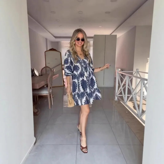 New Fashionable V-Neck Ethnic Pattern Printed Dress Short Skirt Summer Style A-Line Dress