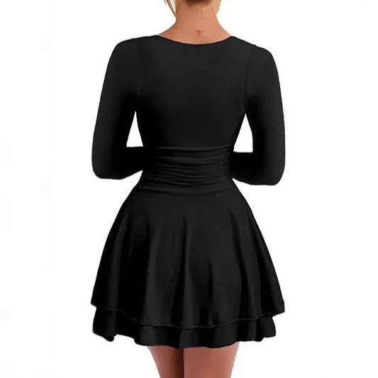 Elegant Winter Long Sleeve Square Collar Slimming Dress Sexy Girl Fashionable Short Skirt Pure Color Polyester Milk Silk