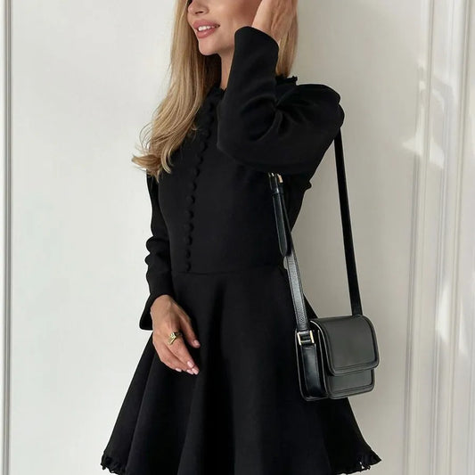Spring Summer New Black Long Sleeve A-Line Dress Commute Women's Fashion Elegant Polyester Fiber Round Neck Basic Style Dress