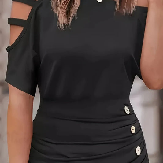 Elegant Asymmetrical Hem Side Button Decorated Fashionable Women's Dress European Style Short Sleeve Bodycon Dress