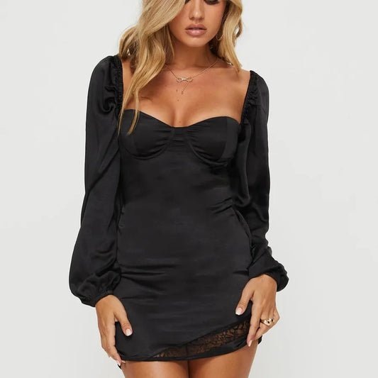 Spring Sexy Long Sleeve Slim Fit Women's Dress Fashionable Elegant Bodycon Gown Polyester V-neck Lantern Sleeve Dress
