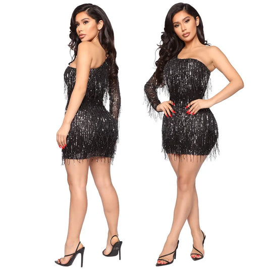 women's black dress sexy off shoulder sequins long sleeve solid color above knee