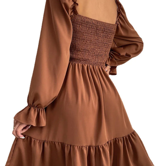 women's a-line skirt fashion square neck ruffles long sleeve solid color knee-length daily