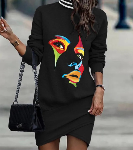 Women'S Irregular Skirt British Style Turtleneck Printing Patchwork Long Sleeve Leopard Skull Above Knee Daily