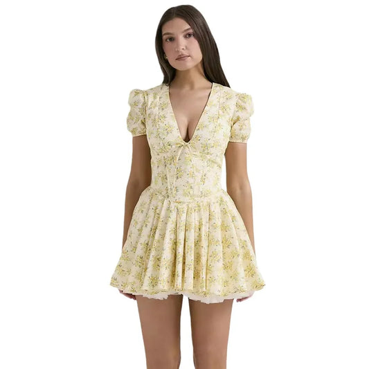 Wholesale Women's Vintage Style Vacation Ditsy Floral Holiday Tea Party V Neck Short Sleeve S1562