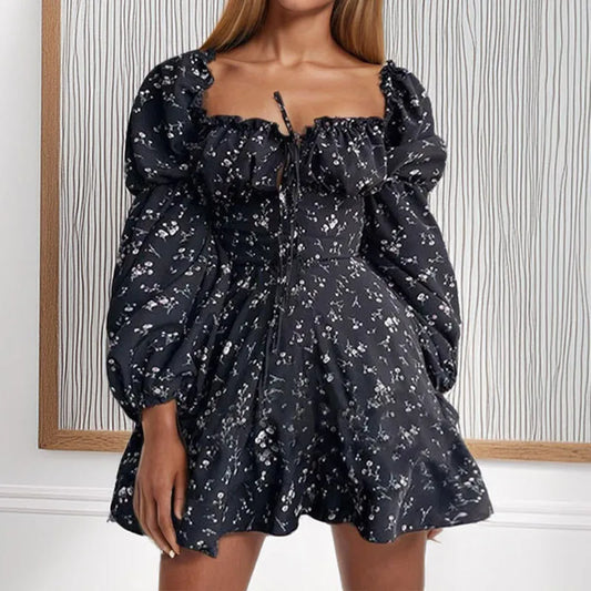 Wholesale Women's Elegant Style Bohemian Tropical Straps Printing Office Weekend Daily Basic Model Square Neck Long Sleeve Fairy dress