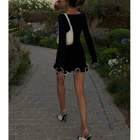 Women's Sheath Dress Sexy Round Neck Lettuce Trim Long Sleeve Color Block Short Mini Dress Holiday