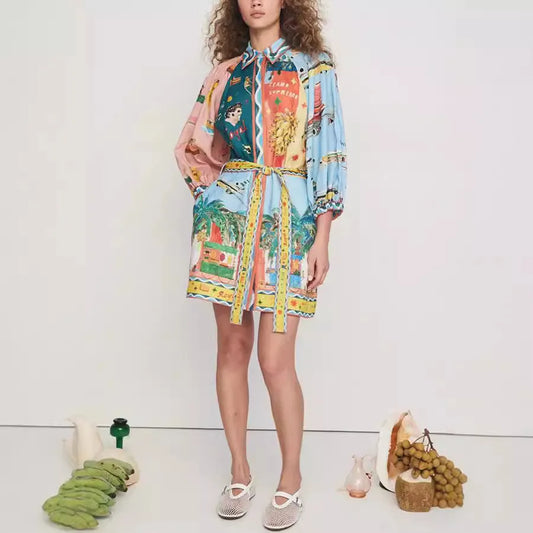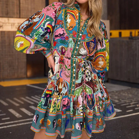 Women's Regular Dress Casual Vacation Standing Collar Printing Button Long Sleeve Printing Above Knee Holiday