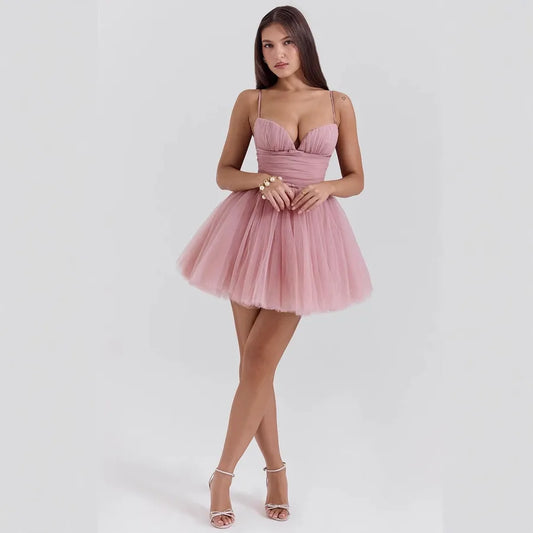 Sweet Mesh Splice Princess Style Mini Dress Sexy Slim Fit Backless Women's Dress High Waist A-Line Skirt V-Neckline Sleeveless