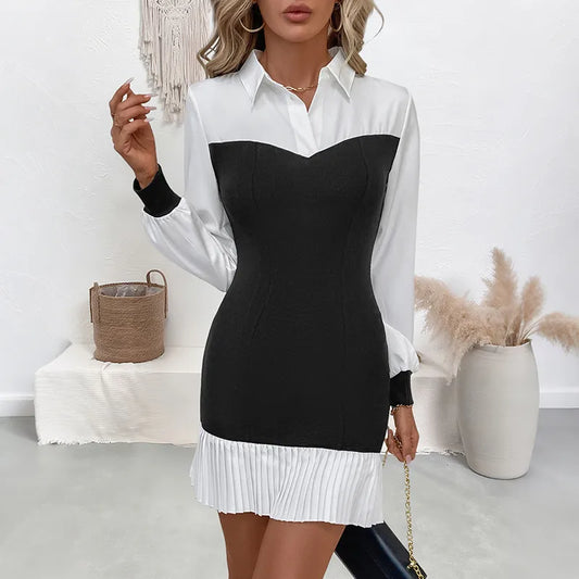Fall Trendy Color Block Commute Work Skirt Dress Women High Waist Bodycon Fake Two-Piece Long Sleeve Knee-Length Dress