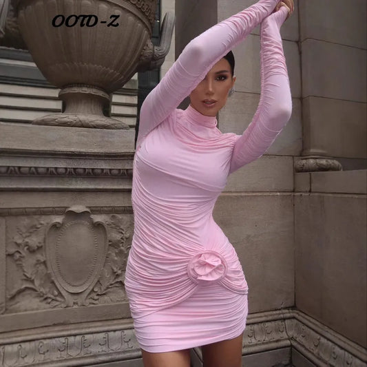 Sexy 3D Rose Flower Long Sleeve High Collar Party Evening Pink Mini Dress Women's Folded Skirt Gown