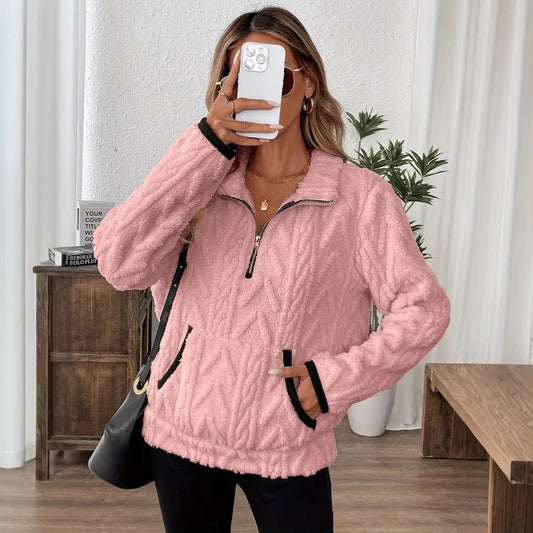 Fall Winter Short Plush Hoodie Half Zipper Turn-down Collar Embroidery Style Commute Fashion Women's Sweatshirt