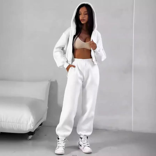 Women's Hooded Pure Color Open Cardigan Sweatshirt Set Loose Fit Long Sleeve Street Style Two-Piece Polyester Zipper Closure